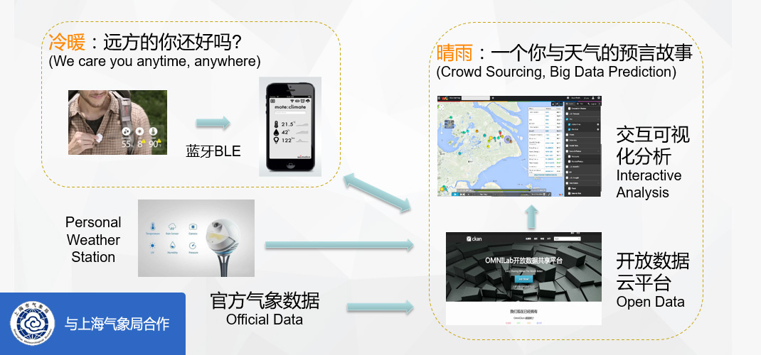 气象徽章是一个可穿戴的环境感知智能硬件产品,结合手机App,通过公众的广泛参与,采集温度、湿度、气压和紫外等气象数据,在上海市气象局的支持下,与官方实时气象数据融合,为用户提供更加精准的气象预报信息